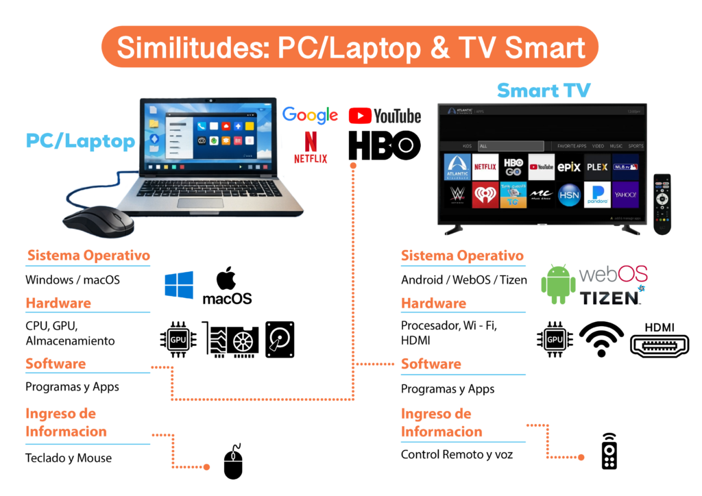 Para explicarlo vamos a tratar de simplificar al máximo y poner solo los más importantes. Para ser Smart un televisor debe tener ser como una computadora y tiene en si las mismas funciones y partes. Acá te pongo un cuadro para que lo entiendas más sencillo.